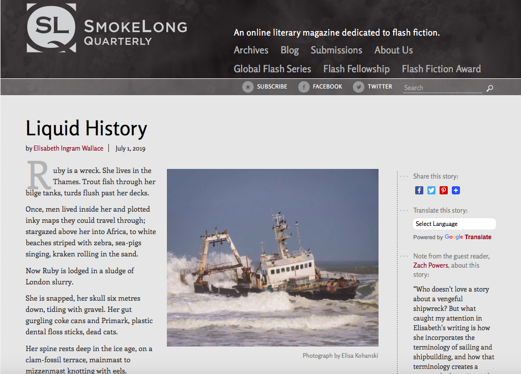 SmokeLong Quarterly is my favourite literary magazine. I often ramble on at elegiac length about it being the Flash Fiction Holy Grail… so I will simply add that being published again in SmokeLong is a flash-writer career highlight.