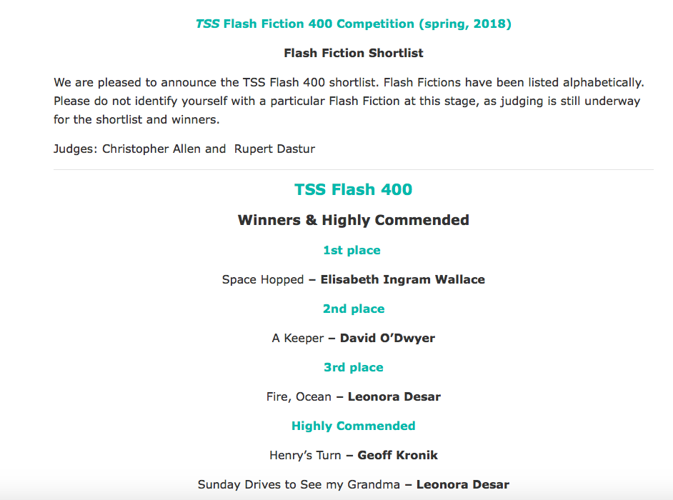 The judges were Christopher Allen,of the incredible SmokeLong, and Rupert Dastur, a writer and editor and the founding director of TSS Publishing.
